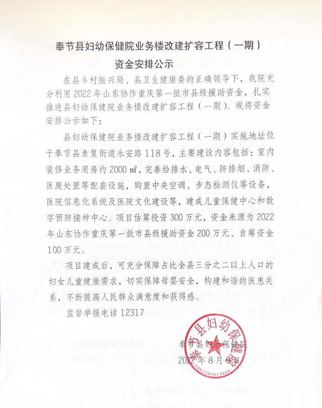 奉节县妇幼保健院 业务楼改建扩容工程(一期)资金安排公示